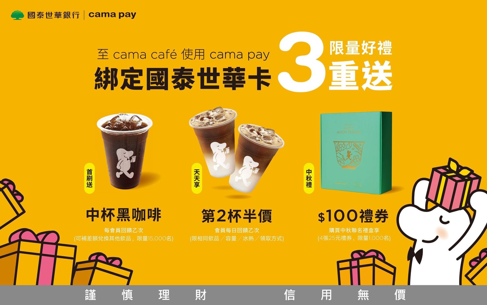 *活動期間:2019/7/22-2019/9/30/本活動僅限購買兩杯相同口味/容量/冰熱領取方式相同之飲品,每會員每日單筆交易最高限購 1 組(1 杯原價,1 杯半價為 1 組),並限當場領取,不提供寄杯與外送服務/符合首刷禮與中秋禮回饋資格者,中杯黑咖啡與禮券之電子票券將於隔週六前直接存入 cama café APP 券匣/中秋禮盒為限量商品,實際供應情況依各門市現場為準/本活動不得與門市其他優惠、行銷活動合併使用/大直植福店、和碩立德店、台北和碩店、汐止遠雄店、板橋亞東店、南港環球店、新光A8店、台大新館店、花蓮車站店及其他百貨商場/特殊通路門市,或其他經 cama 官方網站/APP/社群平台公告之門市,無法使用 cama pay 或享有本活動優惠 / 新設店家開幕期間兩週內不提供cama pay支付服務 / 如會員有違反活動公正或誠信之行為,致重複領取優惠券或侵害第三人之權利,經主辦單位查證屬實或第三人檢舉,有權向會員追回相關費用並依法處理。/ 國泰世華銀行與 cama café 對活動保留最後變更、解釋及終止之權利。