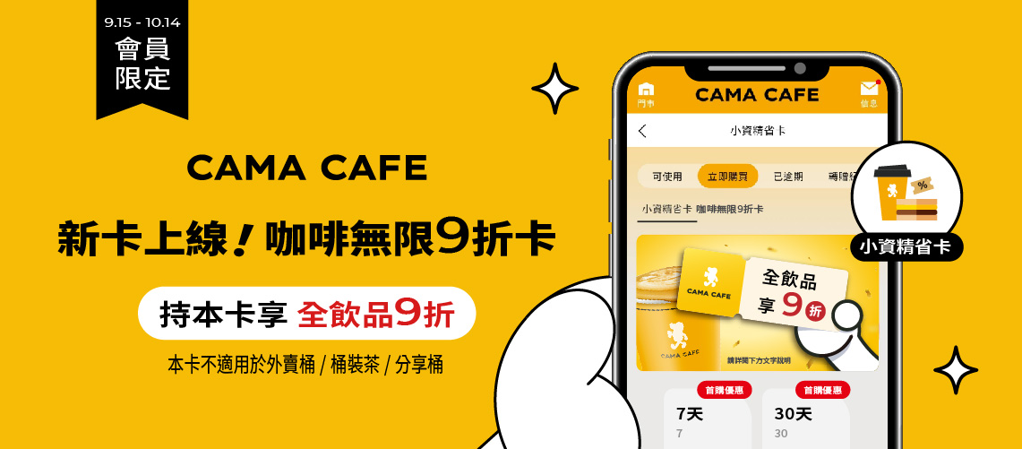 凡購買CAMA CAFE【咖啡無限9折卡】,不限次數飲品9折!